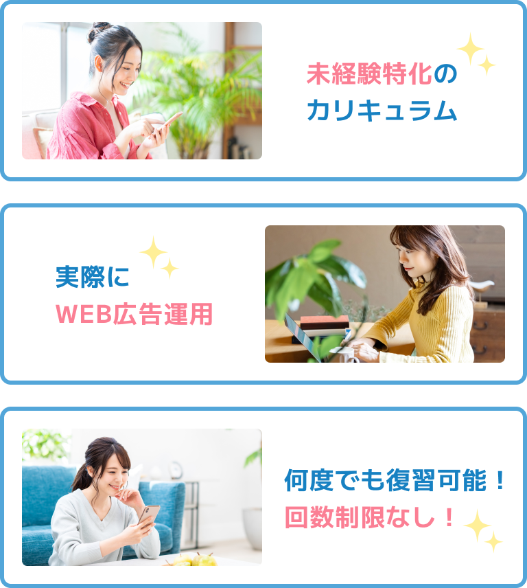 実務を軸に学習し、WEB広告をご自身の手で運用するカリキュラムをご用意しています。